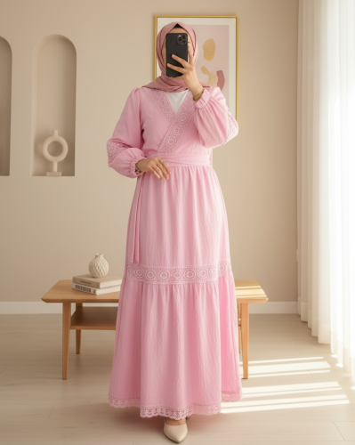 • Dantel Detaylı Bağlamalı Kolu Lastikli Kraş Etekli Takım Pembe